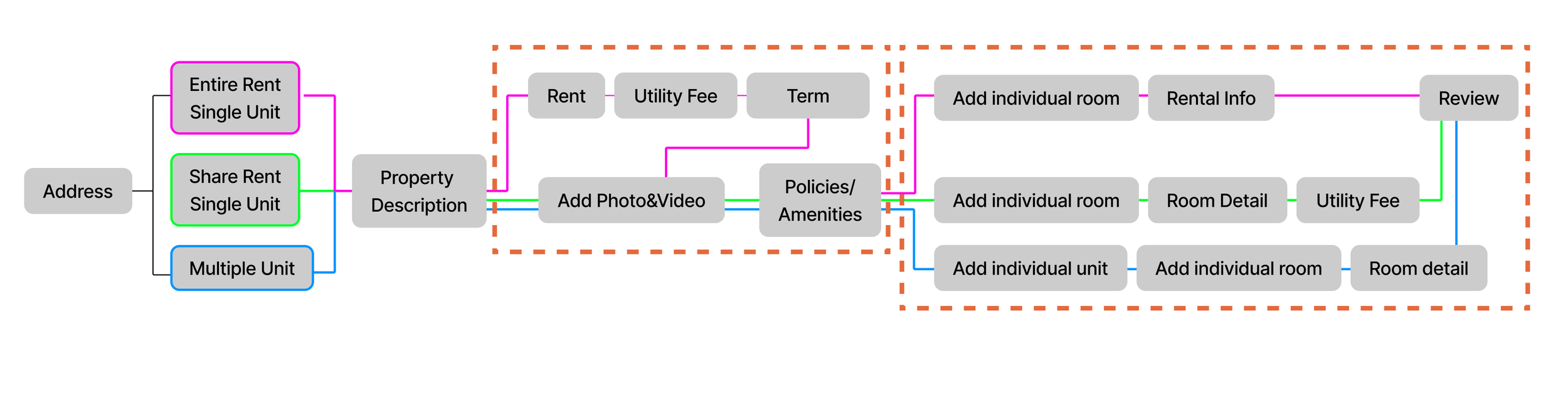 Below is the current listing process involves multiple steps. User flow map with designed screen that shows the complexity of the previous design.