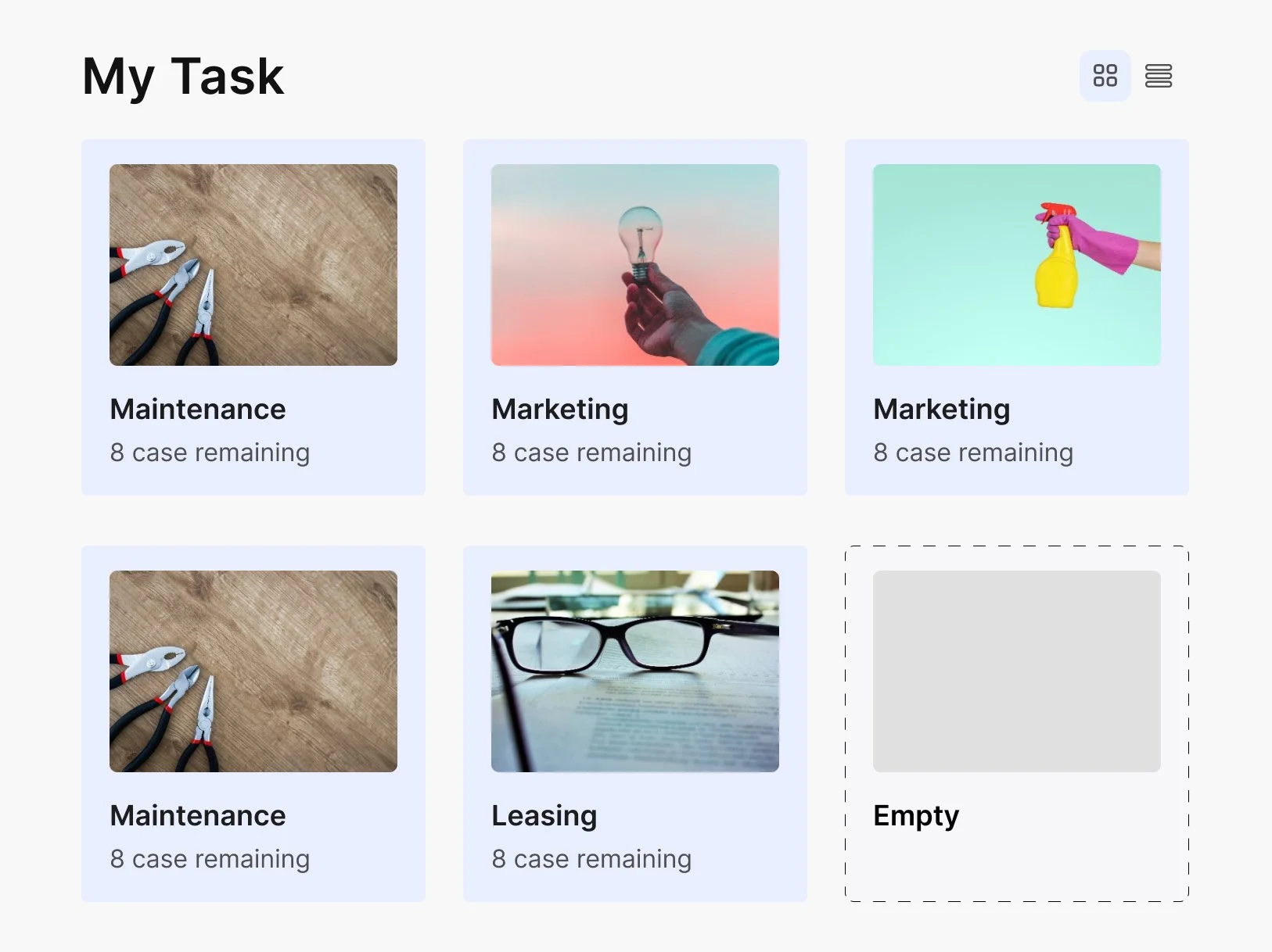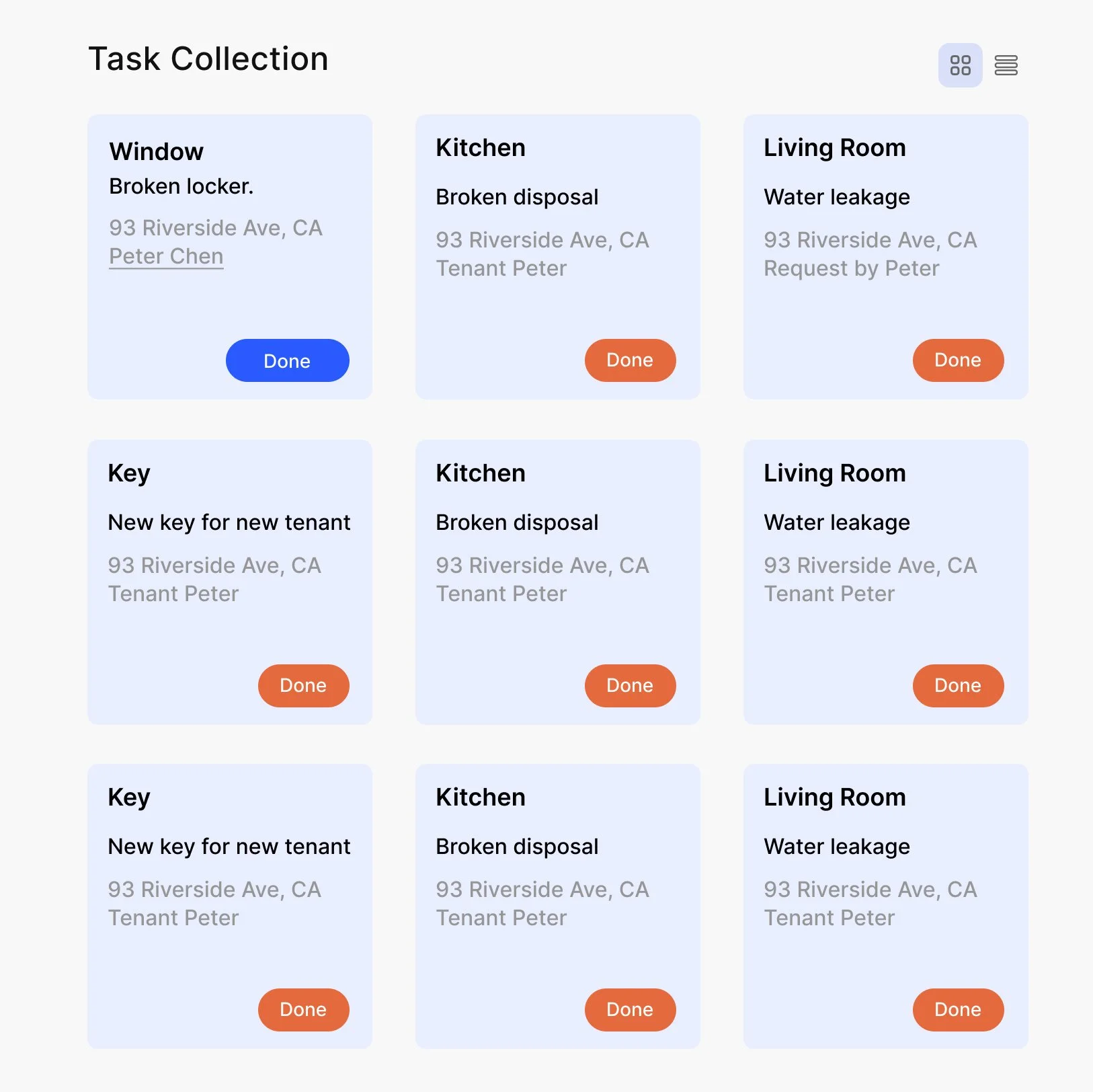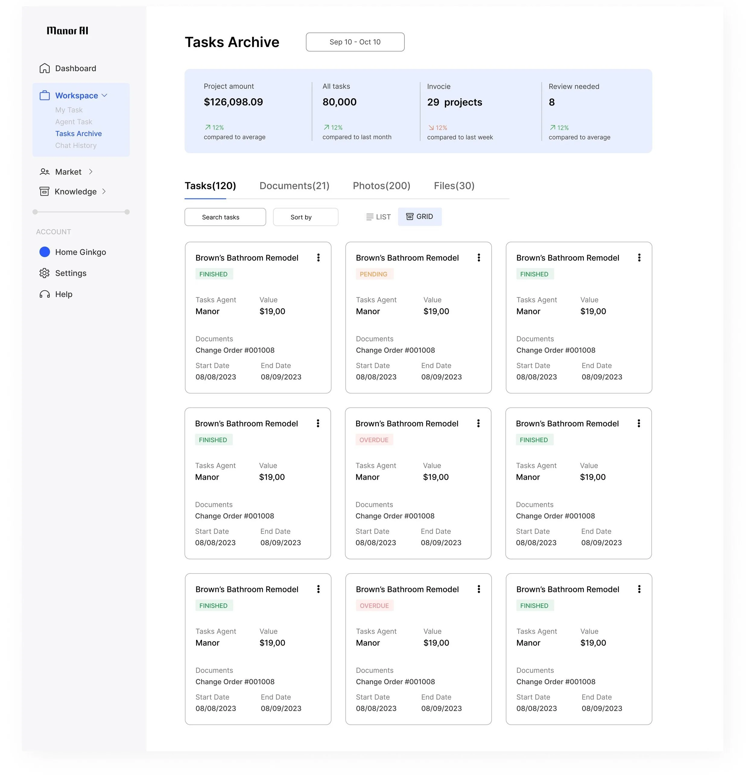 Each task card provides essential details, such as task agent, status, and related documents, with grid or list views.