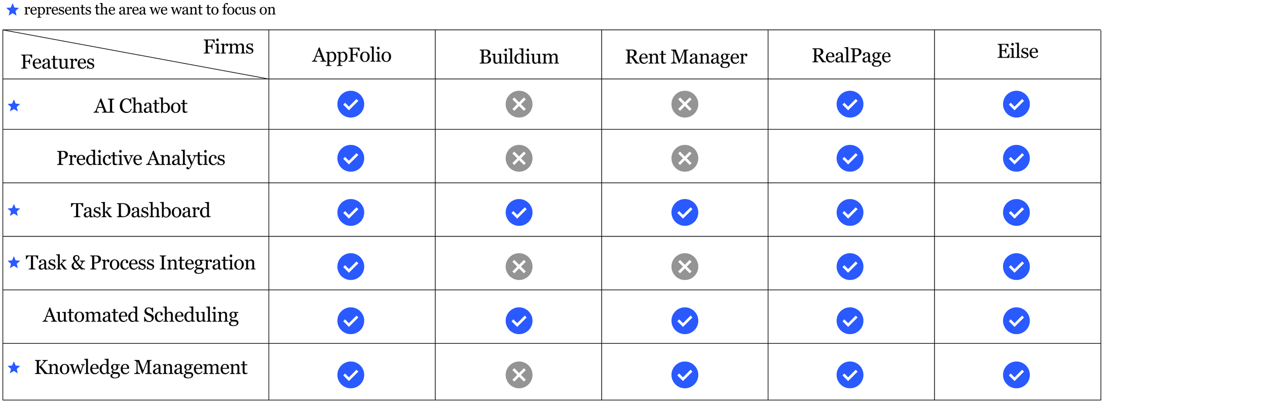We conducted an analysis of several PMS firms includes established players alongside emerging startups. This helped us prioritize the MVP elements for the first phase of development. After analyzing the competition, we marked few most used features as our target, showing with blue star.